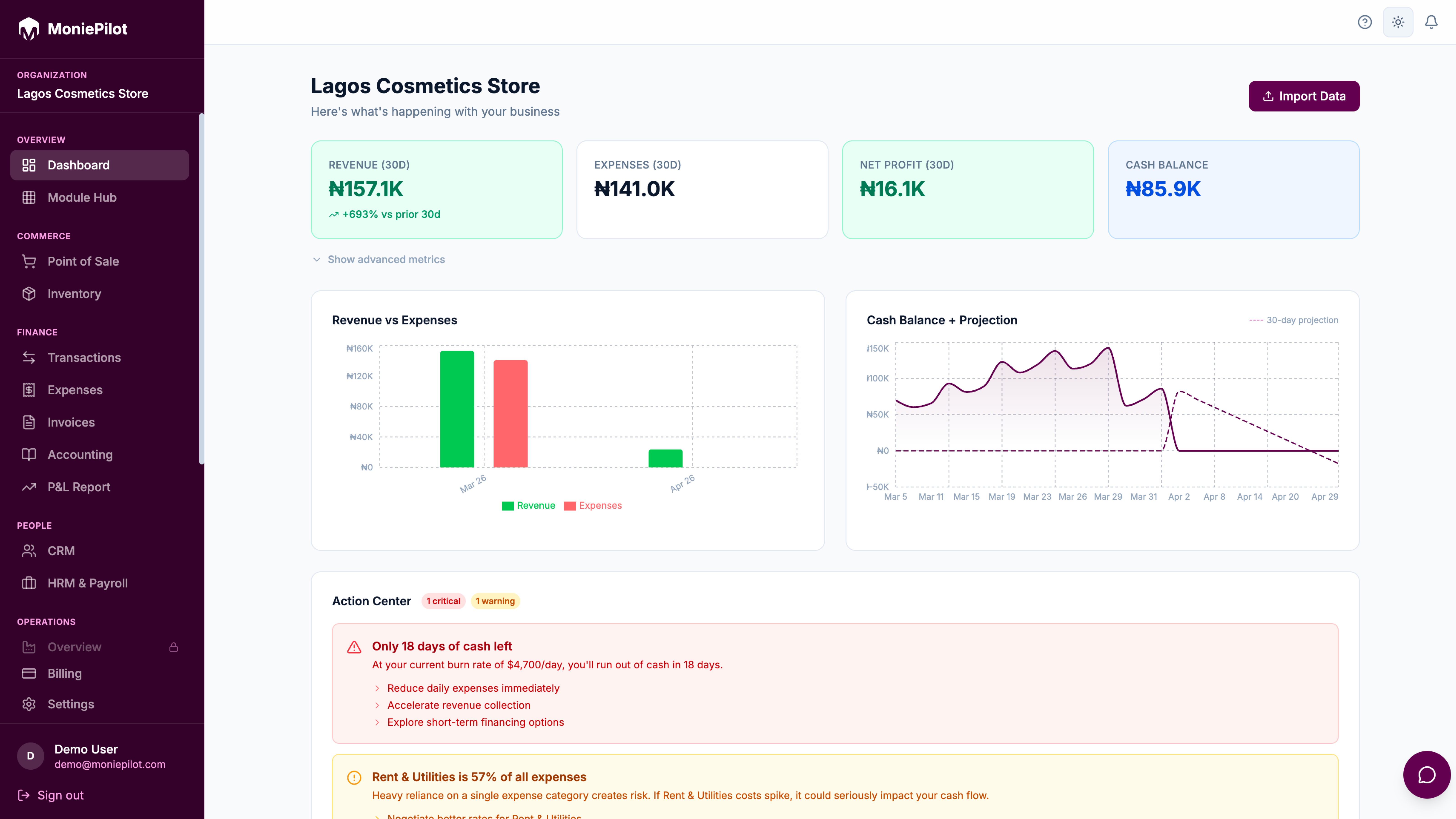 The Action Center tells you when expenses spike, stock runs low, or revenue drops. Before it costs you. With specific steps to fix it.